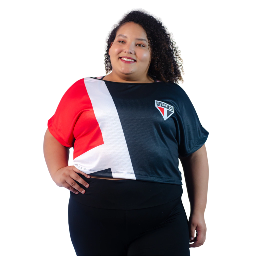 CAMISETA CROPPED FEMININO LICENCIADA SÃO PAULO FUTEBOL CLUBE PLUS SIZE DRY FIT COM GOLA CANOA E MANGA JAPONESA